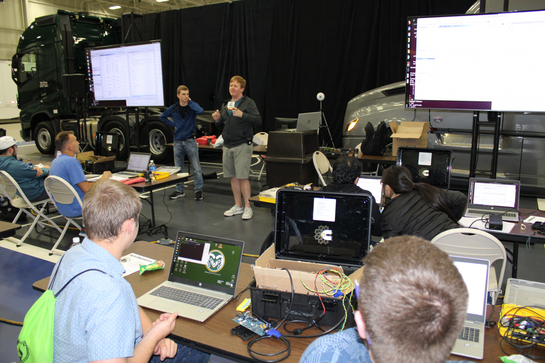 After the vehicle orientation, students were split into two groups (A and B) and found an empty student laptop to begin instruction. Some of the instructors have release their slides with the links below. However, the slides alone are insufficient to understand the experience for the students. For example, part way through the Truck Systems and J1939 class, students are instructed to identify some of the parts and components of a truck by opening the hood and inspecting the engine compartment with guidance from industry representatives. Each class has its own flavor and specialty necessary to examine different aspects of cybersecurity as it relates to heavy vehicles.